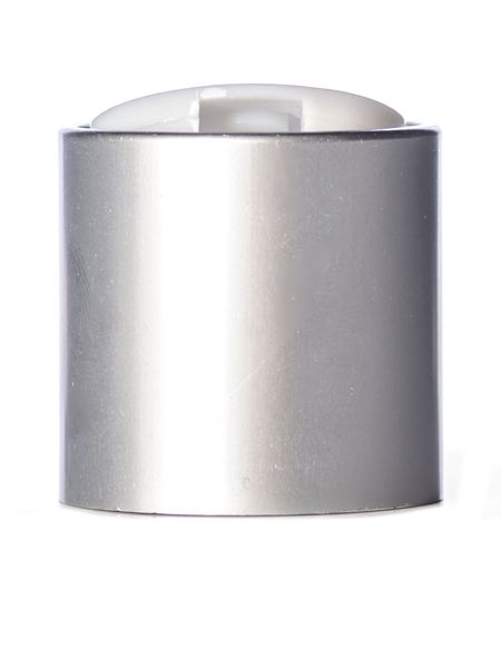 The L312P is a 24-410 disc top cap featuring a white polypropylene (PP) skirt and a brushed aluminum shell. This two-piece closure allows easy product dispensing by pressing one side of the disc, which snaps up for use and then securely closes with a reverse motion. The silver matte finish adds an elegant touch, suitable for packaging personal care items like shampoo, lotion, and creams.