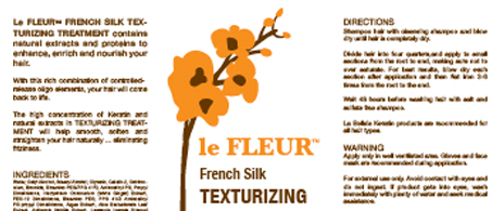 Art.To print a bottle, you’ve got to have art. Art (or artwork) is typically a digital rendering of what you want on the bottle. It is designed at 100% scale and can have 1-2 colors (we’ll do a third color if you really twist our arms and want to pay for it). It’s typically designed using professional design software like (my favorites) AdobePhotoshop, Illustrator, orInDesign. Word, Excel, or Paint, don’t cut it. You can hire a professional artist to help you get your artwork ready (hint hint, 1-800-473-4144). Here’s an example of some artwork for the fictional Le Fleur French SilkTexturizing Treatment. This is a two color silk print project (orange and brown):